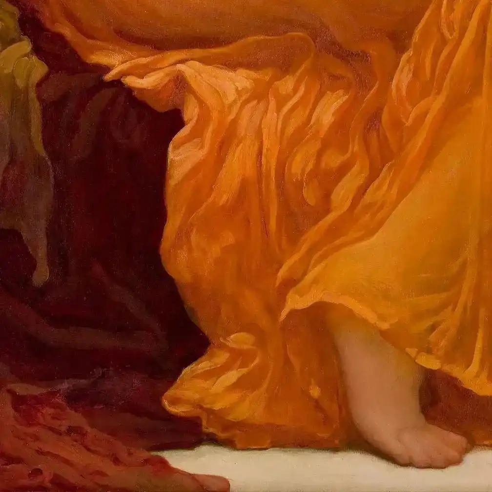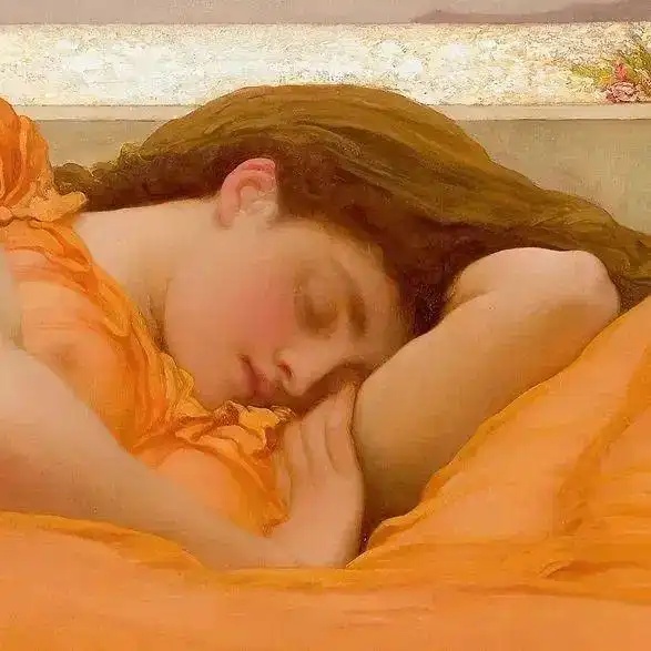 这幅《炽热的六月》(flaming june)是莱顿的代表作之一,画中模特多萝西·丹恩(Dorothy Dene)自19世纪80年代中期之后成为莱顿许多作品的灵感来源。独特的视角,加上模特身体优美的弯曲,使这幅画与众不同,评论家把这称为女性身体的韵律。艳丽的色彩也使这幅作品格外抢眼。作者:弗雷德里克·莱顿(Frederic Leighton,1830-1896),19世纪末英国最有声望的学院派画家,他辉煌的艺术光芒甚至冲淡了雷诺兹的影响,成了英国皇家学院派的代名词。不像19世纪大部分画家那样,莱顿并没有在皇家艺术学院学习,他在布鲁塞尔、巴黎、法兰克福接受绘画训练,1852年他搬到罗马居住,古典艺术给了他很大影响。1855年,他回到英国,他的作品《圣列的行进》展出并被维多利亚女王购买,这是他事业的转折。1878年,莱顿当选为(英国)皇家艺术学院院长。1896年受封为男爵。他是英国唯一获此殊荣的画家。他于同年去世。