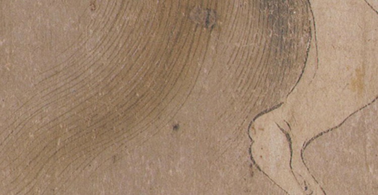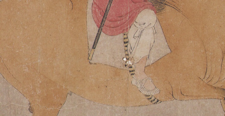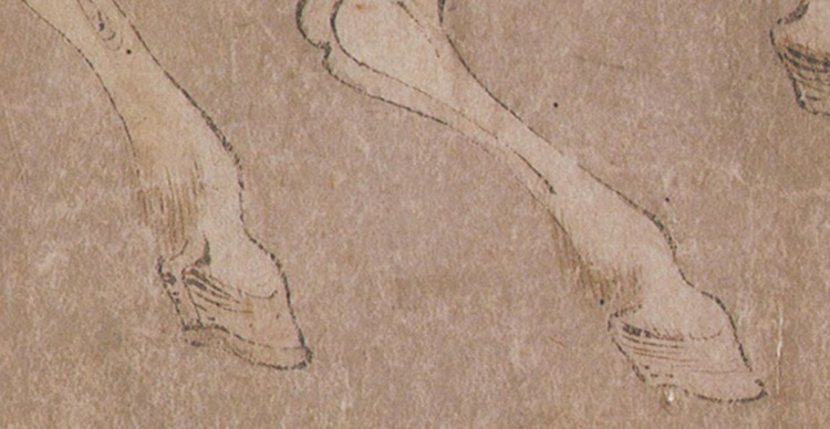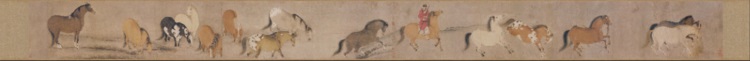 画面开篇二匹马儿玩耍动态的并排前行,整个画面便动了起来,画面最后是一高头大马在立定观望整群马,身形健硕尤为突出,似乎是头领呀。它的站定与整个画面中都在运动的其他同伴形成了鲜明的动静对比,加上它深棕色的身形让画面顿时变得稳定了。整幅画中的马都很健硕但并不失骨感,长长的鬃毛、活泼安逸的安神、有力的四肢一看就知道非一般人家劳作或历经战火的马儿,它们生活的那么好,真似天马一样。韩幹不愧为画马高手。