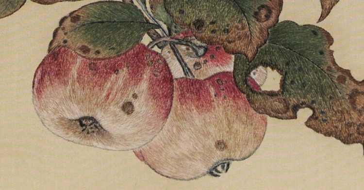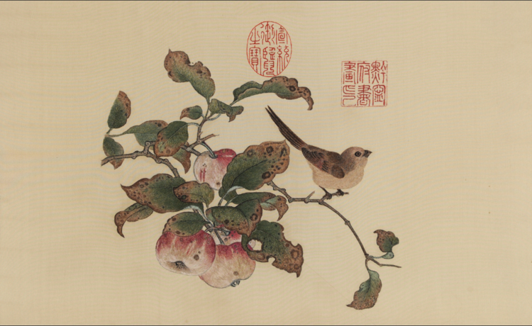 南唐,在那样的环境里竟有画如此!这灵鸟儿似乎在好奇地观看立于树前也正好奇观看它的你。它踩在自己熟悉的果树枝上,尾巴上翘,毫无惧怕飞逃的打算。平常人画果实植物多半是叶肥果润,而黄筌这幅画却是果实熟透,果子与叶子均被鸟啄虫咬,树叶也已经发枯,一眼便让人认出深秋的季节,这小肥鸟也该要多吃些准备越冬了吧。