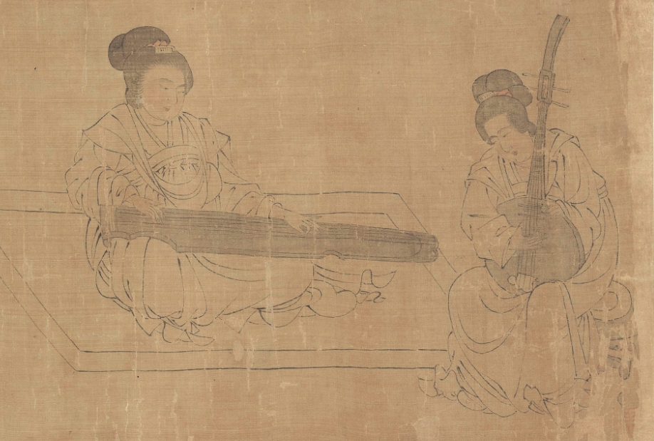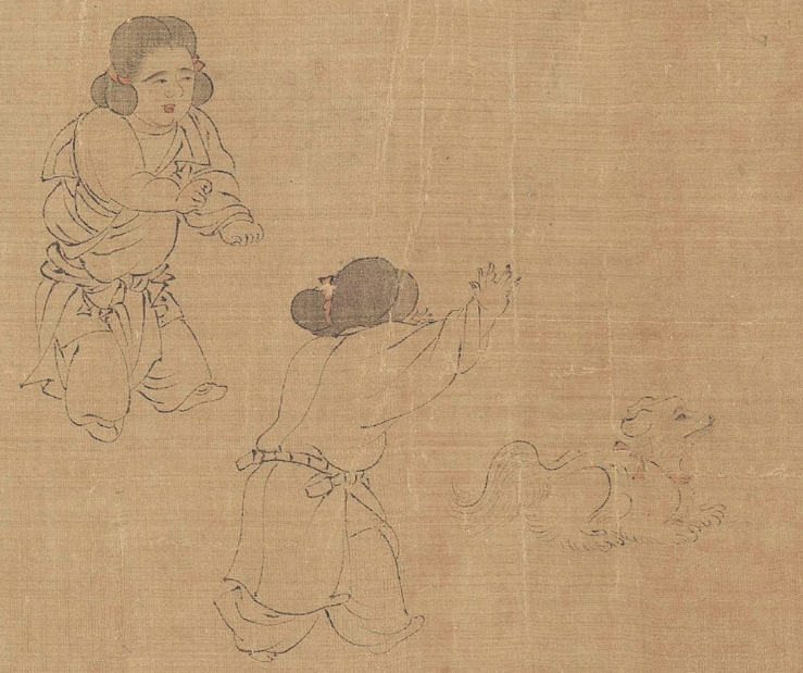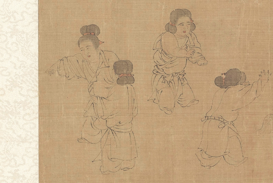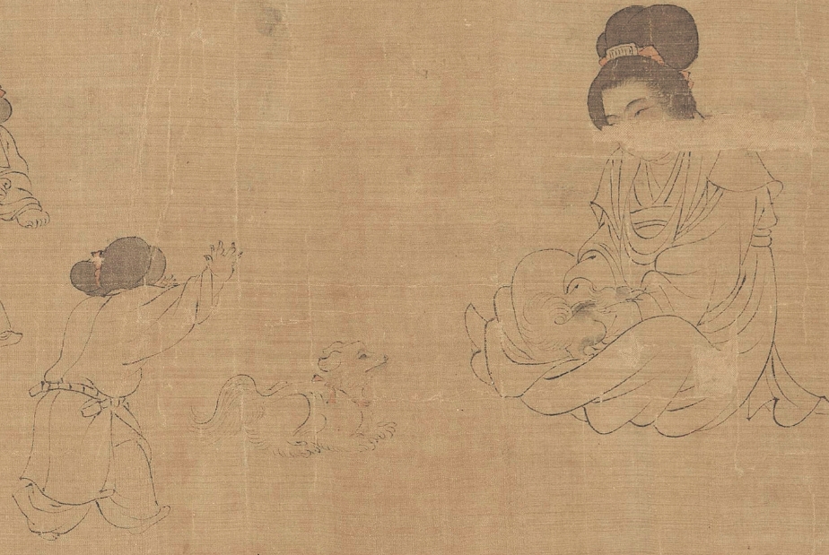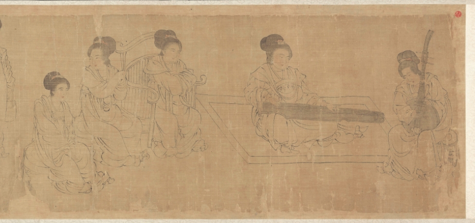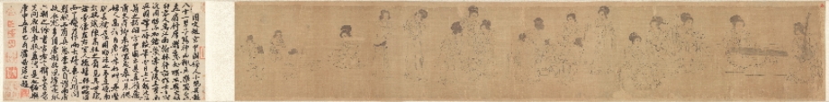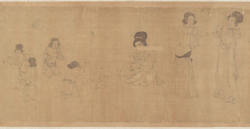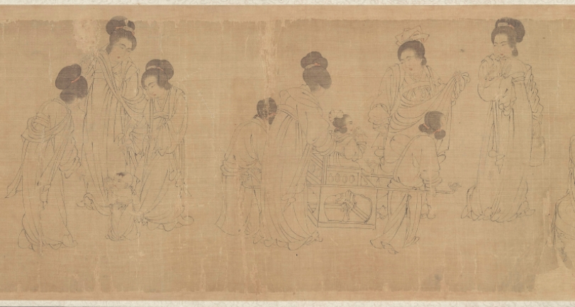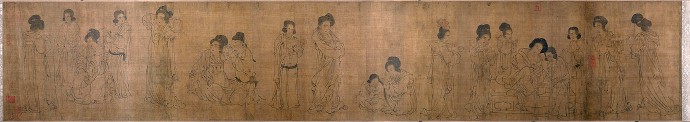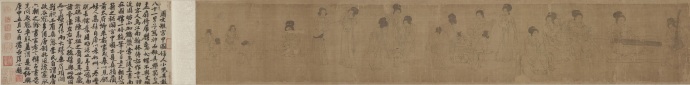 第一段曾名《仕女图》 (Ladies of the Court)纵28.3cm,横168.5cm,现藏美国克里夫兰美术馆(the Cleveland Museum of Art );纵28.3cm,横168.5cm,其画面内容分为六种。自右向左依次为:听琴阮合奏(5人)、婴戏抬辇(6人)、戏婴(4人)、饮食(2人)、逗犬(3人)、婴戏(2人),合计22人。卷后是“澹喦居士”张澂的题跋。