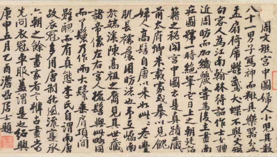 宋摹五代周文矩《宫中图》卷共分为四段,民国初年此卷被人盗出故宫后,被分为四段并于1947年前后被商人交易到美国和意大利。分别藏于