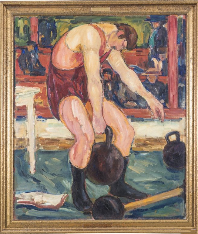 《运动员》描绘了举壶铃比赛。一名精神集中的运动员举起壶铃,周围还有其他重物,公众在背后观看。最初壶铃(当时被称为girya)在18世纪的俄罗斯用来在市场上称重。有些男人会举着它晃着玩,借此来炫耀自己的力量。在19世纪壶铃被马戏团的铁人用在俄罗斯和欧洲的节日和集市的表演上。随着时间的推移,举壶铃成为了一项竞技运动,现在世界各地的健身房都可以看到壶铃。