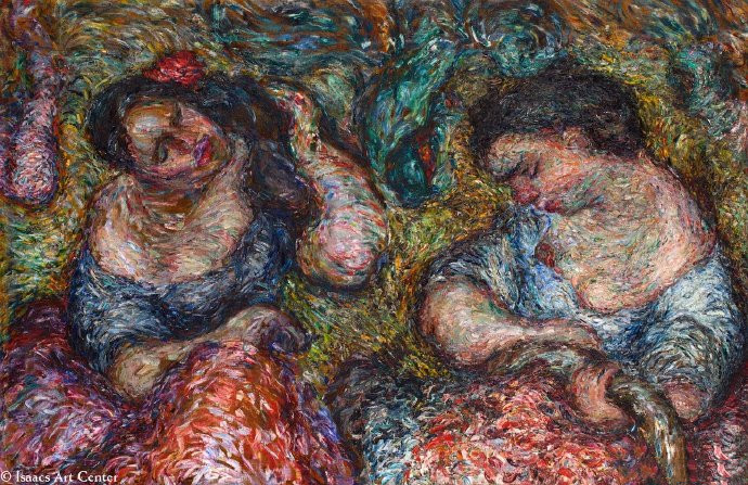在这幅色彩柔和的油画中,两个卖花环的人将生机勃勃的热带花朵编织成美丽而芬芳的项链,这预示着岛屿的今天。她们似乎悬浮在一个超凡脱俗的世界,被色彩和线条环绕,意图表现她们历史悠久的工艺和对席卷夏威夷的社会政治变化的漠不关心。