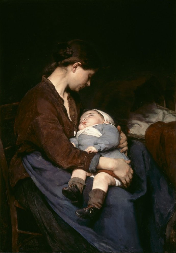 诺斯的绘画以一种对质朴的渴望回应了工业化的普及。这是个下层社会妇女的形象,她的脸在阴影中,刚刚喂完奶,显出一种绝对的宁静。这张画的成功还有赖于薰衣草色、淡紫色和蓝色的迷人组合。