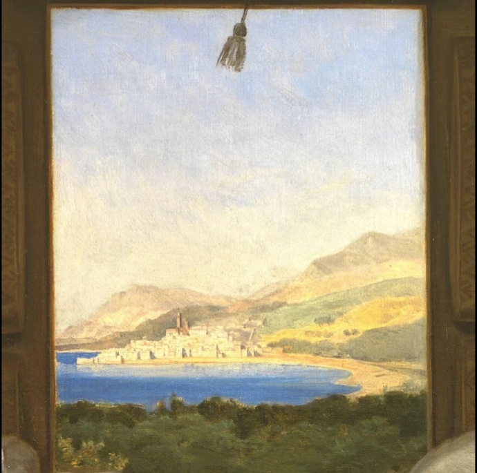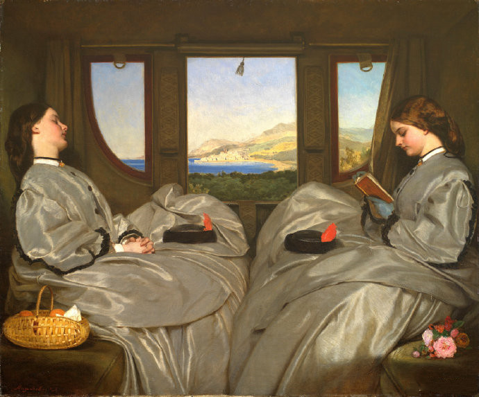 她们穿着同样的衣服,都是宽大的灰色丝绸旅行服,帽子也一样都放在膝头上。她们被对称地安排在车厢窗户两侧的座位上。窗户有三部分,像三联画一样将视野框了起来。透过窗户可以看到法国里维埃拉(Riviera)的芒通(Menton)海岸线,但两位女士似乎都没有在意这风景。百叶窗上摆动的流苏证明了火车正在运动着。车厢本身是对称的,就像着两个女人。