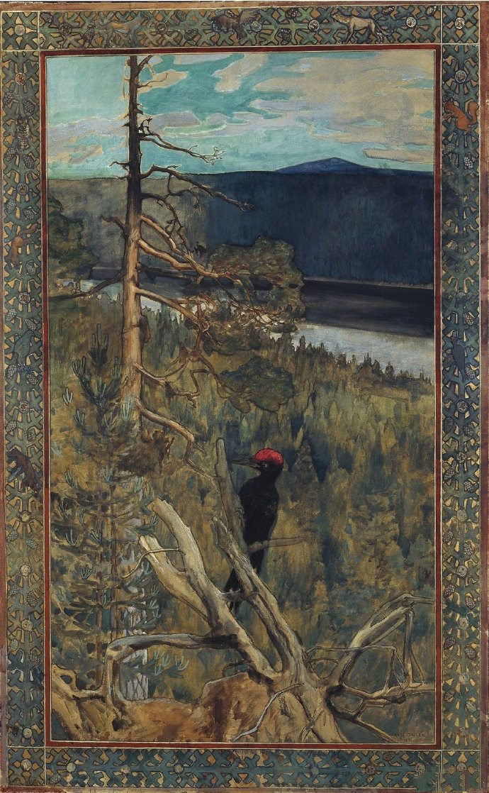 这只巨大的黑色啄木鸟是在卡雷里亚东部的帕纳湖边(现在属于俄罗斯)绘制的。卡勒拉描绘了原始森林中孤独的啄木鸟,用它传达了一种最真实、最纯粹的自然感觉,展现了大自然的不可侵犯性和完整性。
