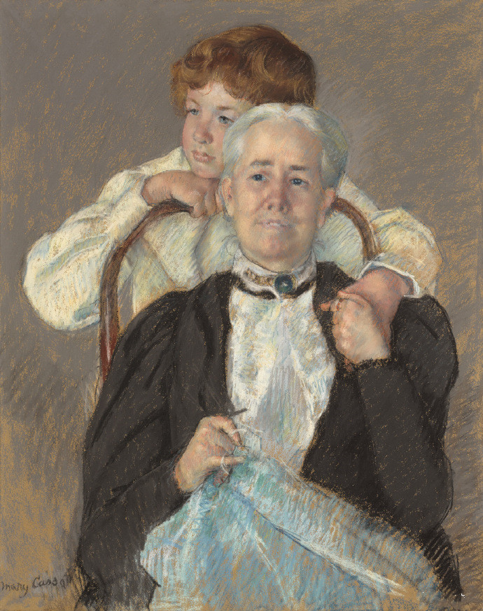 在画面中,艾米莉·劳伦斯(Emily Lawrence)停下手中的针线活,牵着斜靠在她椅背上的孙子的手。这幅肖像画是由艾米丽的丈夫、收藏家塞勒斯·l·劳伦斯(Cyrus L. Lawrence)委托创作的,当时卡萨特正在美国探亲访友,此前她已在国外生活了近20年。