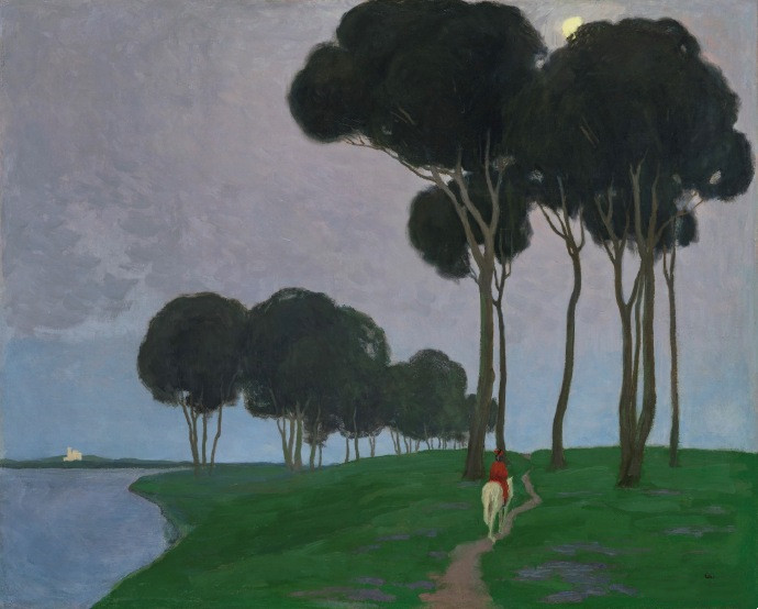 在浪漫的风景与骑手,观众的注意力是捕捉到的曲线,修长的树冠,与背景鲜明的天空被温暖的灰白色月光。对童话般的自然场景的强调是由两种颜色的强调提供的——白色的马和小骑手穿的红色衣服——绿色的土地和远处河那边浅色的教堂。