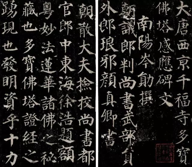 《多宝塔碑》全称《大唐西京千福寺多宝塔感应碑文》,是唐代的书法家颜真卿在天宝十一年(752)写的,反映的是他早期的书法风貌,字体工整细致,结构规范严密,用笔一丝不苟,因而这方碑石也是后人初学楷书最通行的范本。