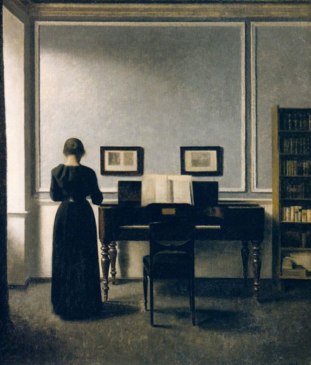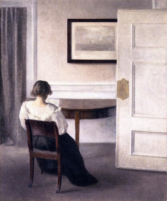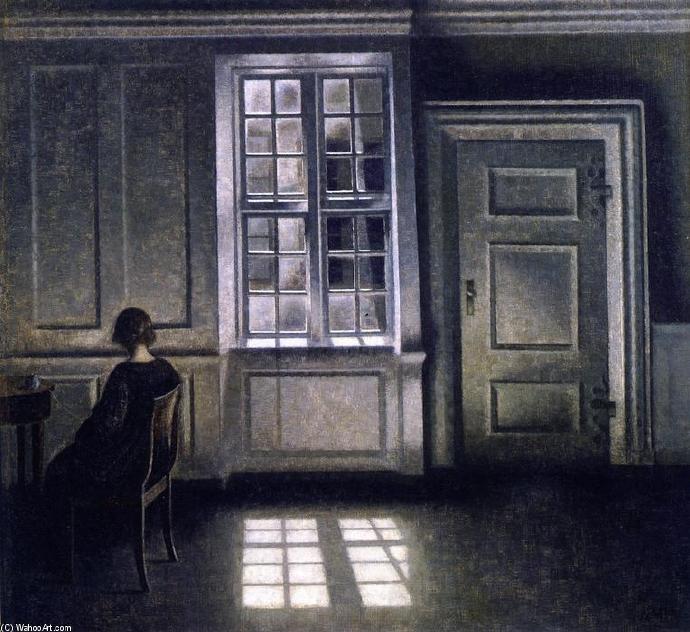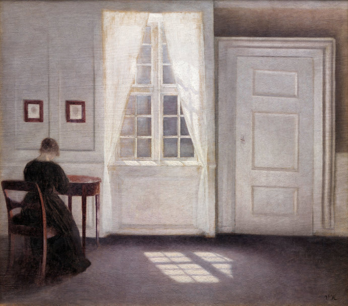 哈默修伊1864年生于哥本哈根,他以孤单、清冷、静谧的北欧室内风格绘画闻名。这些几乎是千篇一律的画作中只有他妻子安静的背影,显得与世隔绝、不可捉摸。虽然以极度写实的笔法绘就,这些仿佛凝固了时空的画作却流露出疏离、去情绪的超写实意味。