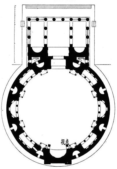 帕尼尼将整个建筑的四分之三纳入到视角的范围:地板铺设为方形,每个方形中包含着圆形。地板的材料属于彩色大理石。四周的墙上有巨大的壁橱(niche)所环绕。壁橱内都有大理石雕像。在标注文字的环形带上方,阁楼使用大理石条纹来装饰。圆顶由排列整齐的凹形镶嵌板相互连接所组成,顶部是透光孔(oculas)。