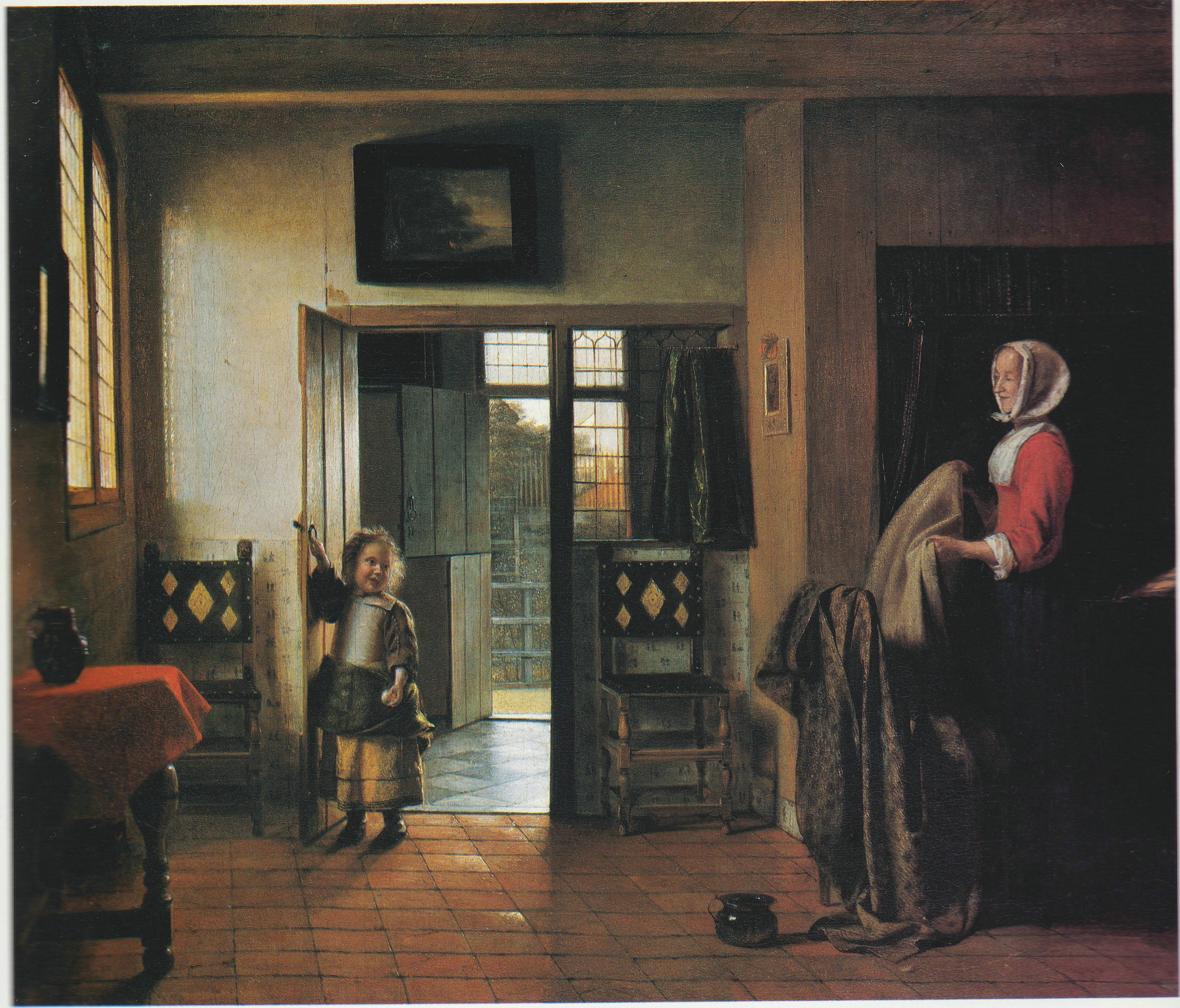 这是日常生活中经常出现的场景。一个孩子打开了通向里屋的门。母亲在里边忙着家务事,她正准备将床上用品拿到外边晾晒。瞬间场景的亲切和温暖的感觉超越了世俗主题的束缚。
