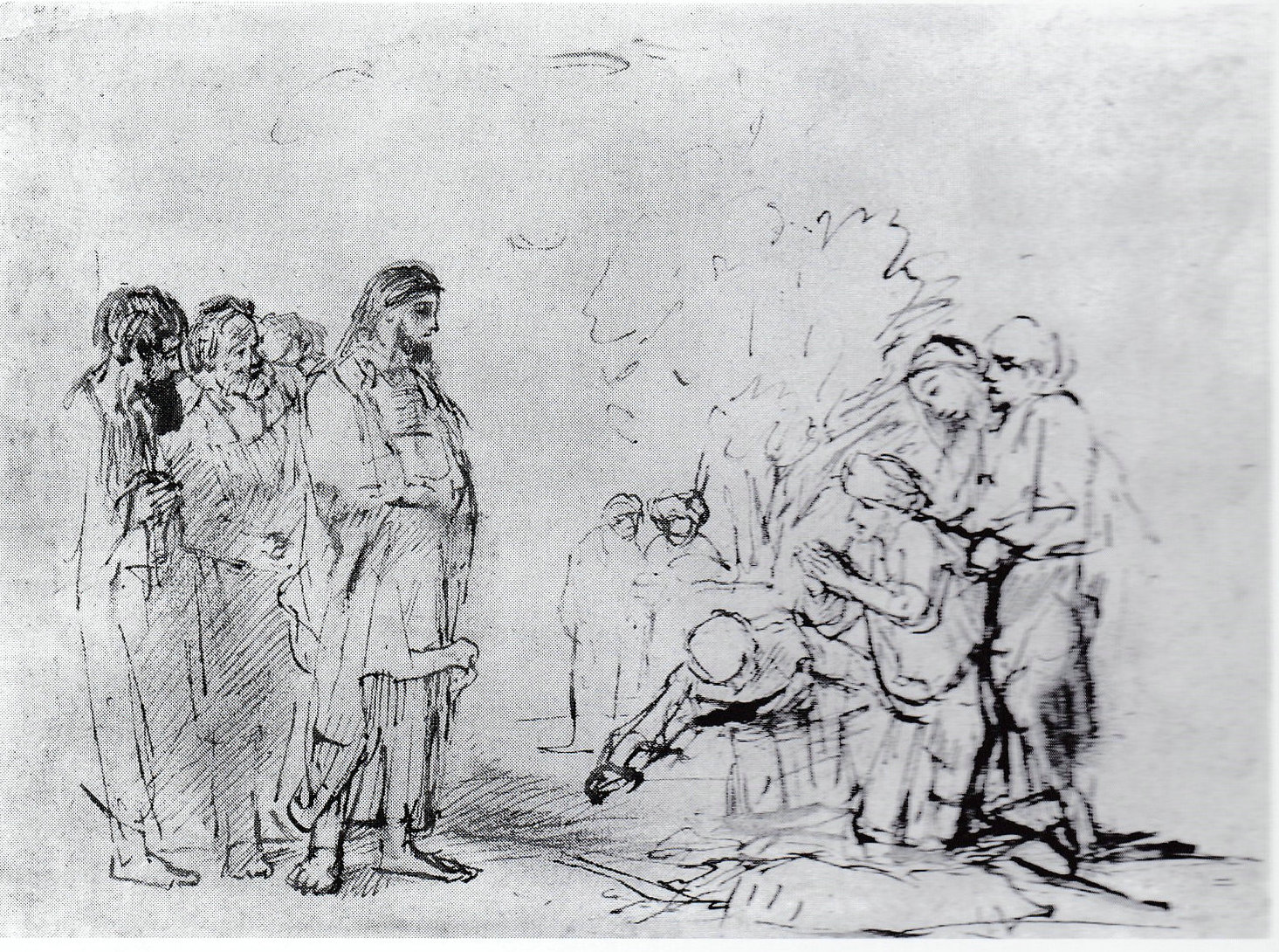 需要补充的是,霍赫的这类生活场景画,除了包含现实主义元素外,还有古典主义元素。特别是后者当时流行于欧洲的主要国家。最杰出的代表人物是法国著名画家尼古拉斯•普桑(Nicholas Poussin,1594-1665)。当时的古典主义除了保留巴洛克的叙述风格外,在画面的布局上强调的是几何图形或直线。例如荷兰绘画大师伦布朗于1655年的素描《耶稣治愈了病人》(Christ healing a Sick Person)中,左侧群组为矩形布局,由耶稣和使徒组成。右侧的群组是三角形布局,由病人和家属组成。
