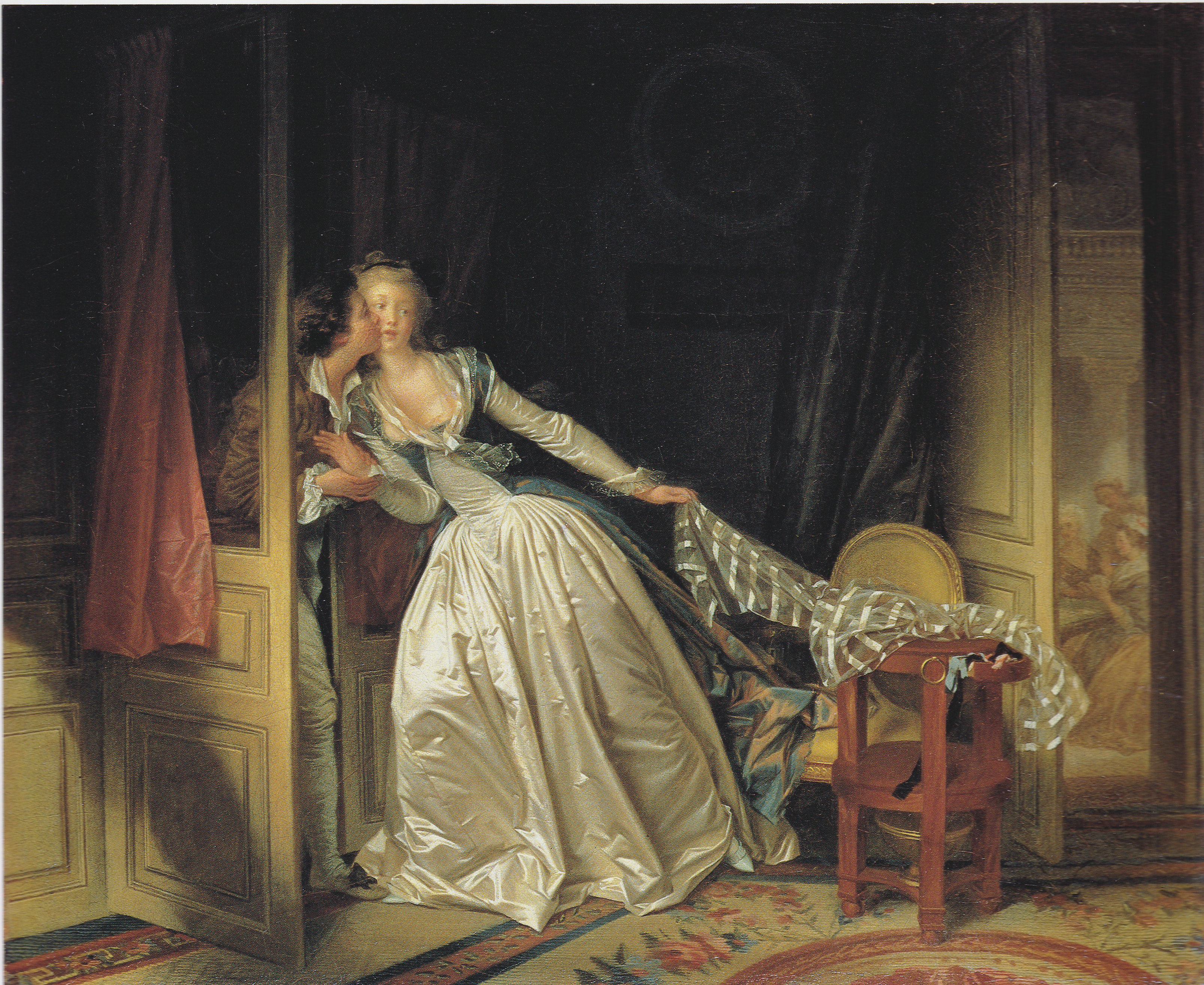 霍赫在这幅画中,使用了门、窗、桌子、画框以及镜子等作为古典主义元素。特别是以打开的门作为主题(motif)元素最具创意,形成了画中有画的场景。以“门”为主题元素的作品,不仅得到荷兰众多的画家所采用。而且在18世纪被法国生活场景画家所效仿。法国著名画家让•奥诺雷•弗拉戈纳尔(Jean-Honore Fragonard,1732-1806)于1786年创作的名画《偷偷的接吻》(The Stolen Kiss)就是一个杰出的例子。