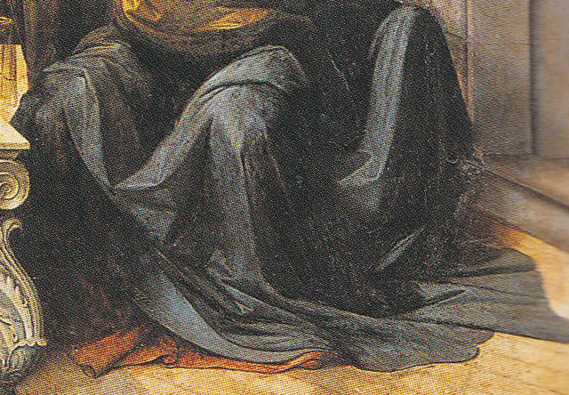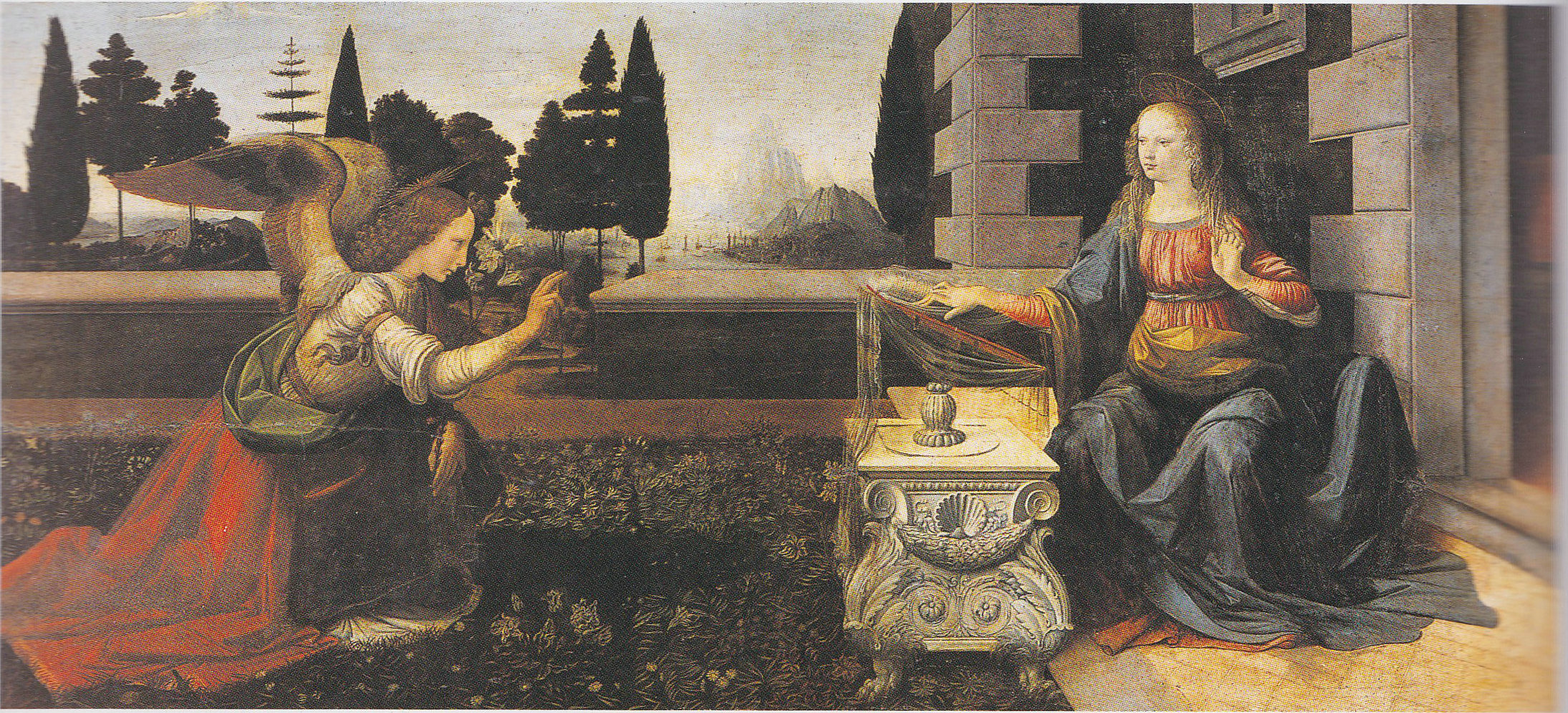 达芬奇的若干绘画作品证实了艺术史学家的判断。例如达芬奇早期创作的作品《天使报喜》(The Annunciation)中,可以看到圣母玛丽亚裙子上褶子的造型与建筑上的石砖交错码放形成了巧妙的对应关系。达芬奇最出人意料之处是将深奥的哲学内涵隐藏在画面中。如果不仔细观察和分析,是很难发现的。