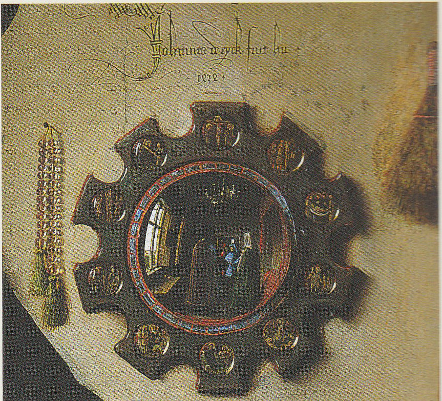 毫无疑问,扬•范•艾克试图探索一种全方位表达逼真效果的技巧。在这幅画中,他令人信服地描述了各种材料的纹理效果:枝式吊灯上经过抛光处理的黄铜,墙上悬挂的凸面镜子和由成串金黄色珠子组成的玫瑰经念珠, 最为令人吃惊的是在画面上用指尖创造的指印。他不仅能描述光线在各个部件上照射时的效果,而且能让我们看见那些看不到的窗户留在镜子上的影像。