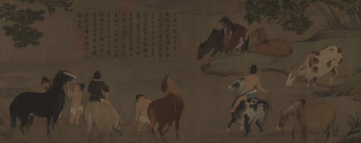 图中绘夏日疏林间,奚官在水塘为骏马洗浴纳凉的情景。人物与马各具姿态,生动自然,相互呼应,营造了一个轻松的氛围。人物衣纹流畅,树木坡石勾勒简练,色不掩墨,青绿与浅绛结合,色彩清丽雅致。