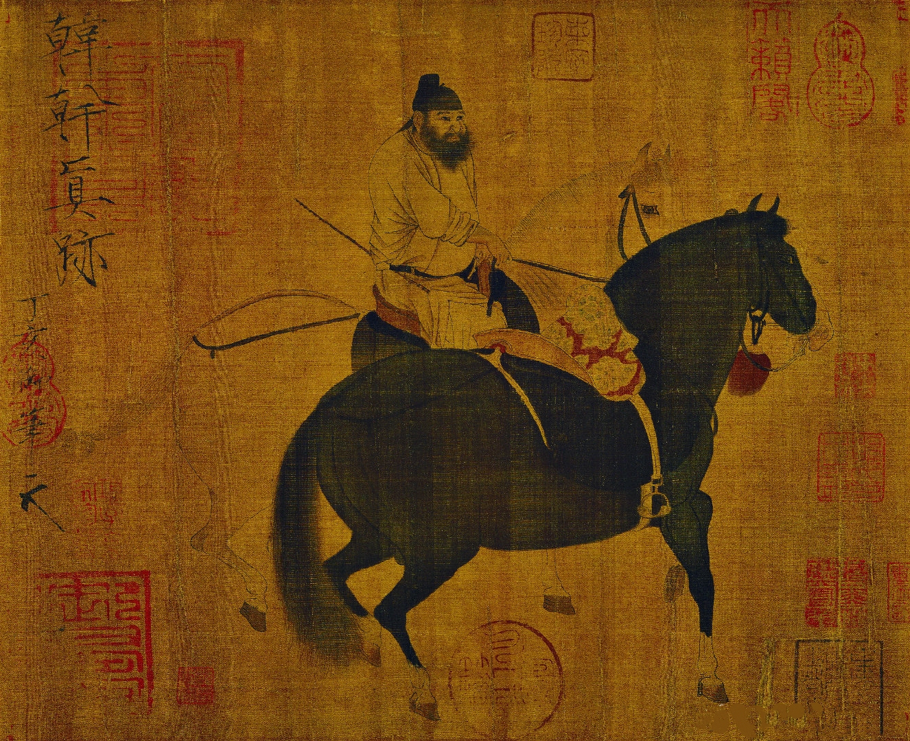 牧马图,绢本。纵27.5公分,横34.1公分。台北故宫博物院藏。 浅设色画,黑白双马,胡人骑一而控二。幅上宋徽宗题“韩干真迹 丁亥御笔”八字。人物与马俱极生动,徽宗瘦金体书题字亦挺劲,并有南唐御府藏印,为韩干真迹无疑。另有玉花骏、照夜白等骏马图。