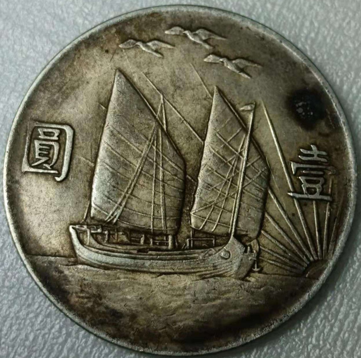 孙中山像三鸟帆船壹圆银币,发行于民国21年(1932年),俗称“三鸟币”,因为图案设计的“寓意”被曲解,造就了它戏剧性的短暂的命运。总铸量为226万枚,实际流通5万枚左右,其余全部被熔毁。