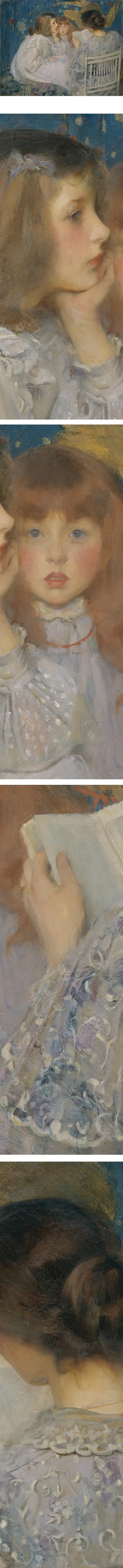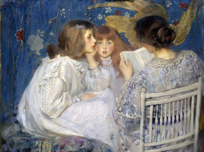 《Jungle Tales》(丛林故事)James Jebusa Shannon著。被大都会艺术博物馆收藏;美国艺术家詹姆斯·杰布萨·香农(James Jebusa Shannon)职业生涯的大部分时间都在英国度过,这里展示了他妻子给女儿和她的一个朋友读书的亲密场景。《丛林故事》可能指的是拉迪亚德·吉卜林(Rudyard Kipling)于1894年出版的《丛林之书》(Jungle Book),该书是在这幅画完成的前一年出版的。 对年轻姑娘美妙而敏感的描绘。脸仍然像画家一样,轮廓柔和;半透明织物上图案的指示是由单一的笔触或点画组成;头发呈现出足够的纹理笔画的暗示,我们的眼睛充满了丰富的细节。