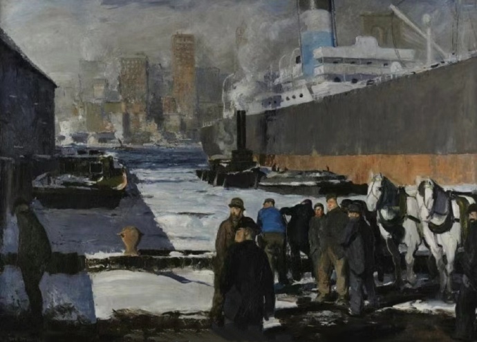 乔治·韦斯利·贝洛斯(1882.1.8-1925.8.12),美国现实主义画家,以其对都市生活的大胆描绘而闻名,绘画充满力量与动感。《码头工人》这幅画充满了讽刺。靠手工装卸船只的码头工人或装卸工为临时工,通常是新来的移民。他们的工作经常受到腐败的工会老板的控制,他们的生计岌岌可危,名声也很差。贝洛斯将这些人置于曼哈顿的天际线上,凸显了讽刺意味,作者将现代资本主义这个充满活力的中心与人们的严酷现实进行了对比,他们的劳动使这些工作得以运转。该图左边驼背的人完全处于阴影中,与人群保持距离,突出了他和这个群体的格格不入。