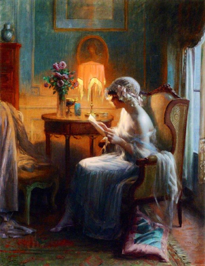 画家作品的情境之美,其实就是对于室内的温馨系列画面的展示,所有的场景都是在黄昏,或者夜晚,美人在灯下的阅读成了主要的画面,这个与吾国古代女子无才便是德不同,这个共和色彩的资产阶级情调的画面,其实是充满近代的时代感觉,充满香艳的乐而不淫的场景。