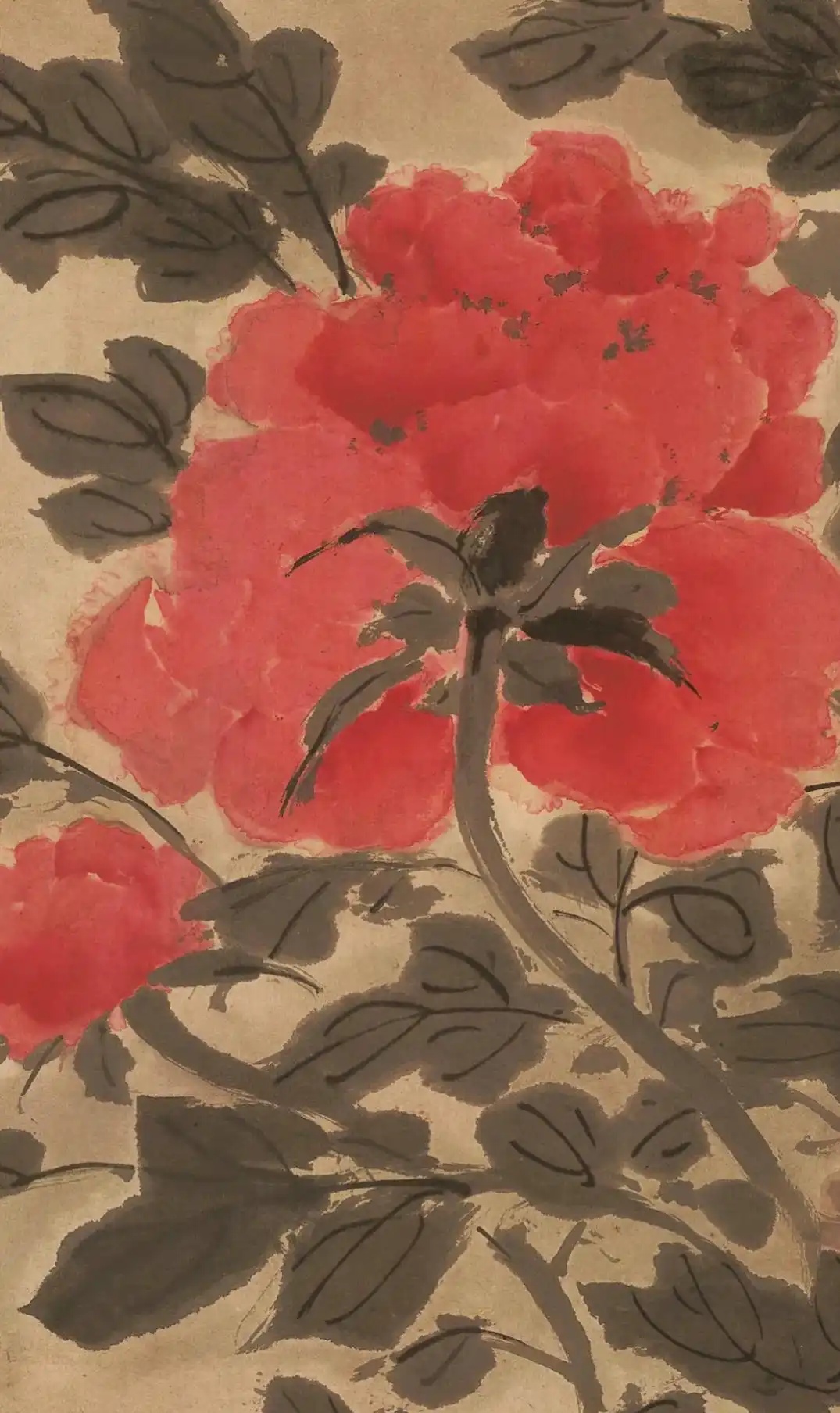 此图绘数珠红、白牡丹于山石前,布满全幅,最后还用石青衬底。牡丹敷以淡粉,用重粉点染边缘,显得晶莹剔透、庄重典雅。整个画面热烈为而秀雅,韵味十足。看似凌乱,实则秩序井然,似乎是信手拈来,流露出自然之趣。牡丹以水墨钩花点叶,花瓣赋彩,不求艳丽,却见笔墨功夫。山石用乱点皴,均脱去常套,对花写貌天趣横生,表现出作者高超的绘画技巧。