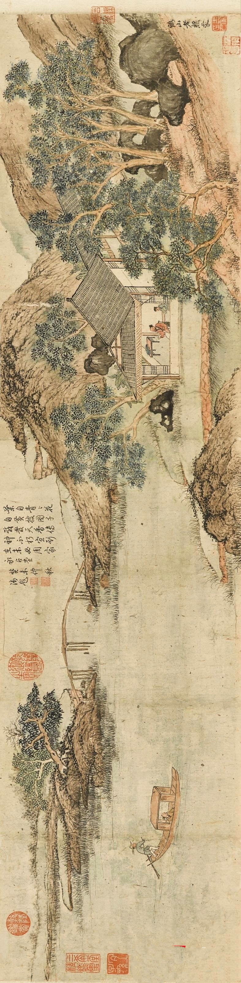 此卷《天香深处图 》附刻上王蒙天香深处图字样之木盒,包巾内侧有王蒙天香深处图真迹上等字样,及玉别子背题乾隆御用王蒙天香深处图。根据钤于画上之鉴藏印分析,本卷应在民间流传至清初翁嵩年遂贡之入内府,画上有乾隆皇帝于癸未1763年仲秋御题诗一首;按木盒盖内陈介祺题识:后得此卷于东武刘氏,始知为内府赐出…,东武刘氏应为刘统勋与刘墉父子,从而推论乾隆皇帝于1763年仲秋至1773年间赏赐本卷予重臣刘统勋。《天香深处图 》因此重现民间,由刘墉传承,其后为陈介祺收藏,辗转流传至现藏家。
