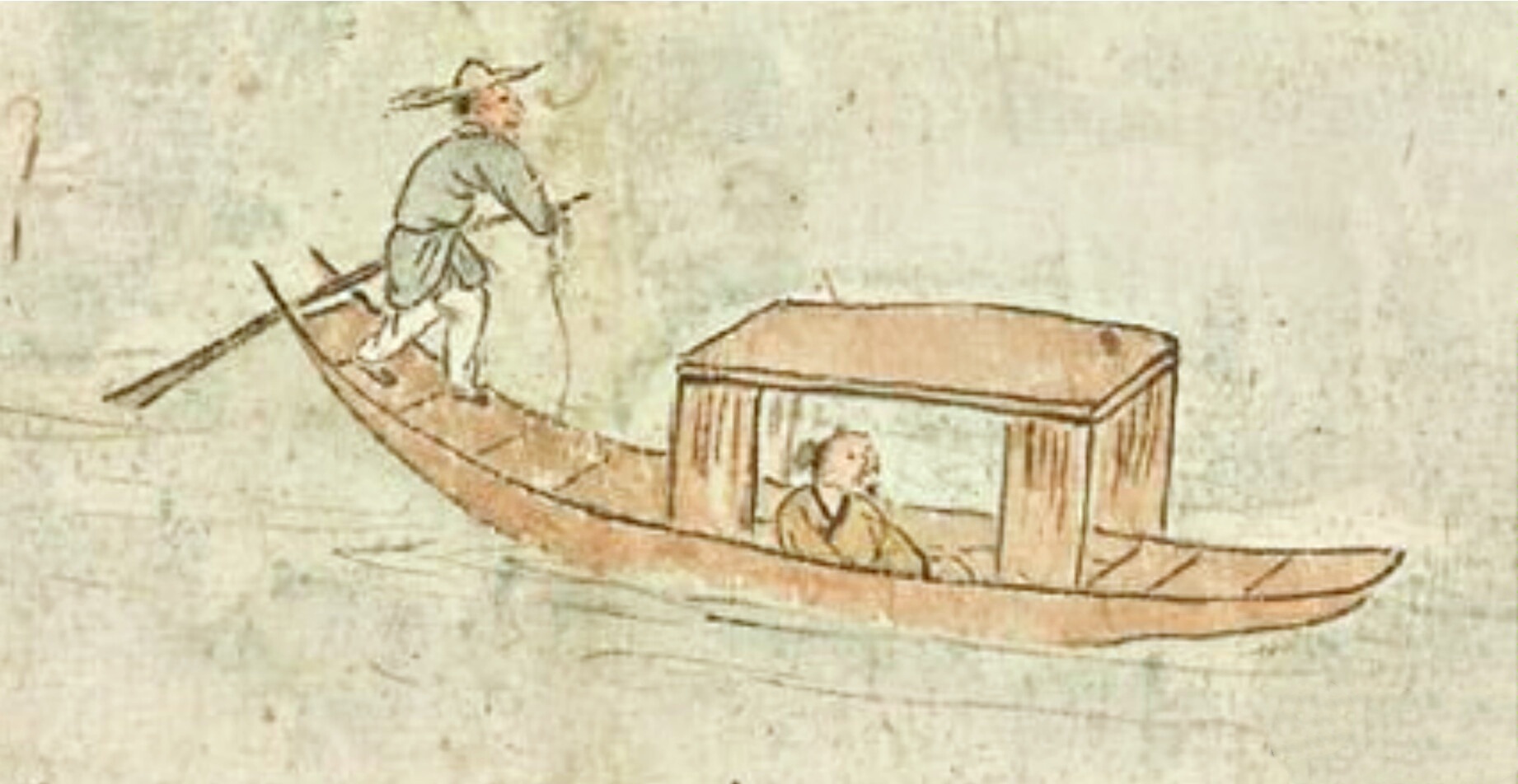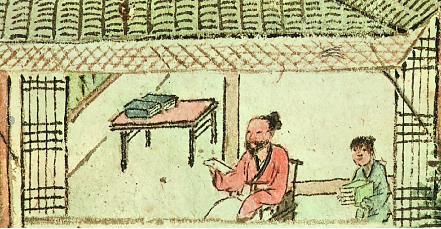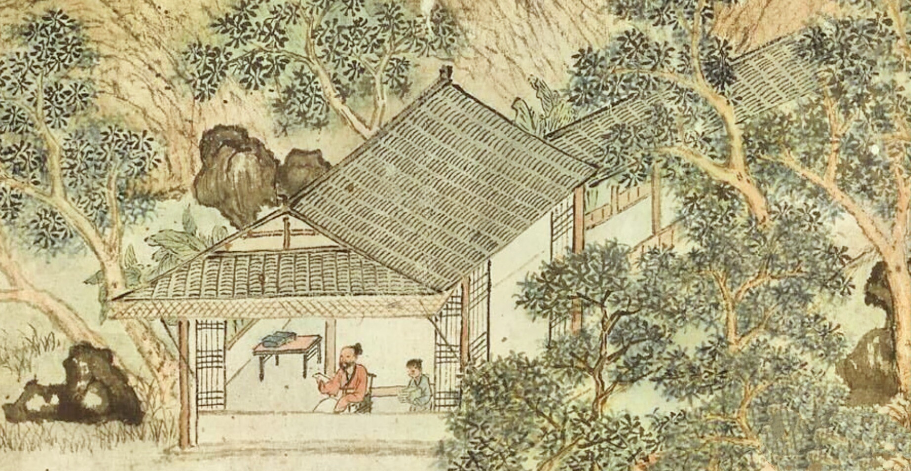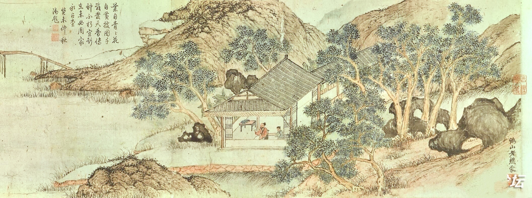 此图绘满山桂树下,潺潺流泉边,数间茅屋,竹窗前有一高士凭案而坐,读书品茗兴味长,“桂子香中鹤梦清”。画面右上为 山村老人楷书款:“桂馆秋高香满帘,有人 点易乱牙签。功名有待三槐旦,幽处无惭五柳潜。压酒掇花金作液,熏茶拾蕊玉为奁。几番醉我西风里,清夜敲诗掀紫髯。山村 老人。” “熏茶拾蕊玉为奁”,以桂花蕊熏茶,放入精美的盒子,可知花茶在元代就有了。其旁有王逢草书诗:“桂丛深处筑茅堂,景入清秋化日长。安坐神游香积界,长吟身到广寒乡。杵花为蕊烦玄思,扫叶烧茶踞石床。见说招溪培植远,满枝风露绿阴凉。王逢。"写山中闲雅,品茗为乐。画面左上自署款:“至正辛卯八月既望写《天香深处图》,黄鹤山人王蒙。”可知此图是王蒙1351年中秋节所画。