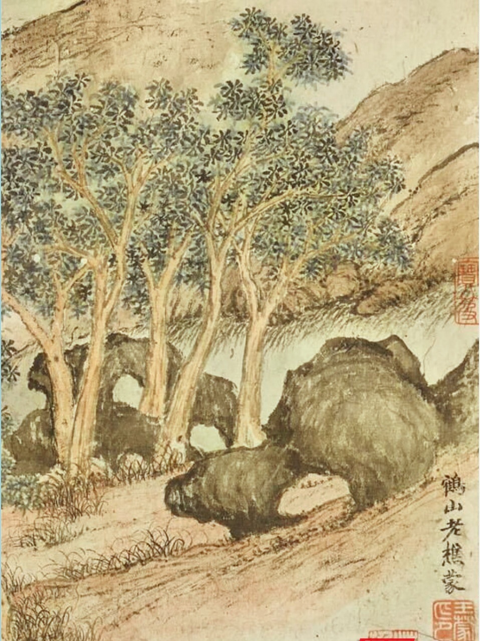 【说明】王蒙(1308-1385),字叔明,号黄鹤山樵、香光居士,吴兴(今浙江湖州)人,元代书画大家赵孟頫(1254-1322)之外孙。王蒙工诗、书、画,尤善山水,画风承继王维(701-761)、董源(934-约962)、巨然(十世纪)且师法自然,独具新意。王氏与黄公望(1269-1354)、吴镇(1280-1354)和倪瓒(1301-1374)齐名,合称为「元四大家」。