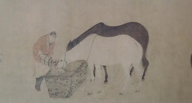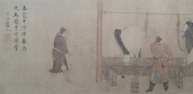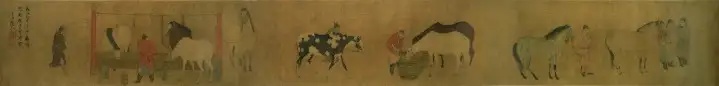 任仁发的《九马图》虽未见著录,但陈高华编著《元代画家史料汇编》(杭州出版社2004年)中的《任仁发》条目内,载元人杨维桢《题跋月山公〈九马图〉卷》前序中有云:“右任公月山《九马图》一卷,马官控而立者二,赴饮者一,渴饮者二,共枥秣者二,立而昂首回顾者二。”共计马九匹,与今之《九马图》相同。诗中还有句云:“图中九马气俱王,都护清骢尤第一。”故杨氏所题咏之画,即今之《九马图》。清骢马应是图卷中从右至左的第五匹马,身上有青白相间之花斑纹。在元代都护府是负责主管畏兀儿(维吾尔)族与汉族之间诉讼事件的司法机构。或有可能《九马图》是一件都护府马官和马匹的写生之作。杨氏所题的《九马图》,是任仁发孙子任士珪(字伯温)所藏。