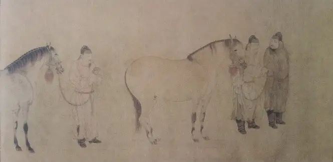 元代初期的书画界盛行一股复古思潮,即舍南宋而直入晋、唐,这其中固然有一定的政治因素。如提倡师宗南宋,恐怕会触及蒙古人敏感的政治神经。复古派的代表人物是赵孟頫、鲜于枢等人,而任仁发也应该是其中之一。就他的画马而论,直接师承唐人韩幹和曹霸的画风,以及北宋李公麟。但韩、曹两人的传世真迹毕竟稀如麟凤,而李公麟应该对任仁发画马艺术的影响至深。肥壮体健,铁线构图,淡色晕染,虽是业余画家之作,却有专业画家的水准。故其画马之名当时可与赵孟頫相提并论,柯九思题任氏《二马图》云:“自曹、韩之后,数百年来,未有舍其法而逾之者,唯宋李龙眠(李公麟)得其神,本朝赵文敏公(赵孟頫)得其骨,若秘书监任公(任仁发),则甚得其形容气韵矣,岂易得哉!”(见宗典编《柯九思史料》)名士顾瑛亦曾有诗云:“月山道人画唐马,笔力岂在吴兴下?”(见《元代画家史料汇编》)