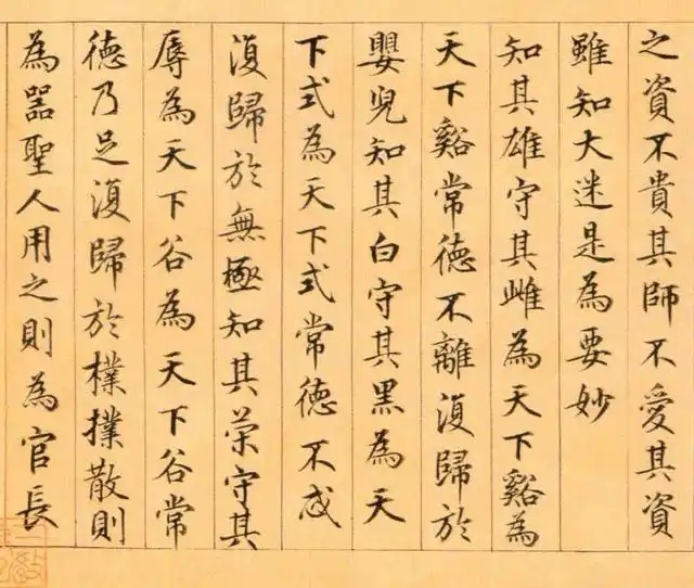 鲜于枢《楷书老子道德经卷》纸本,纵26.7厘米 横642.5厘米,北京故宫博物院藏。此卷学虞世南,体势修长,笔法精美,清爽劲利,是伯几仅见的楷书长篇,当为中年时佳作。此帖从“天长地久”开始,末书“老子道德经卷上”,缺下卷,不具名款。每段接纸有“三教弟子”朱文印。卷后有翁方纲题跋、吴荣光题名、颜世清跋共五段,又“松下清斋”书签。《道德经》文本以哲学意义之“道德”为纲宗,论述修身、治国、用兵、养生之道,而多以政治为旨归,乃所谓“内圣外王”之学,文意深奥,包涵广博,被誉为万经之王。