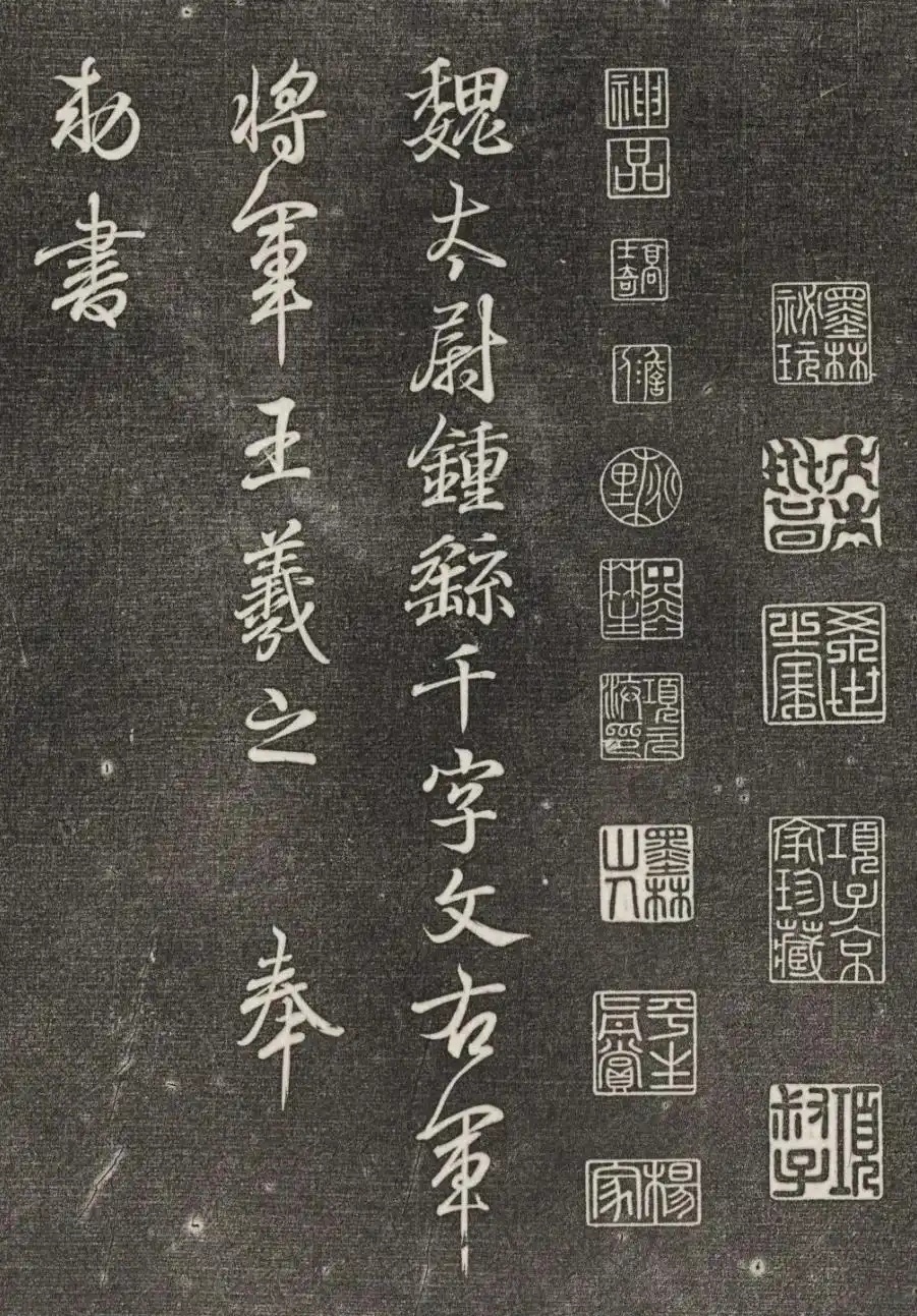 今见《清宫旧藏书精选集》第八本著录三卷相连本《王羲之书魏钟繇千字文》真迹,纵26cm,横787cm,行书166行,行6字计974字,三卷相连。宋《宣和书谱》著录并庋藏。南宋理宗、元文宗、明宣宗、清乾隆、嘉庆帝、明云南王沐府先后鉴藏。(见图)