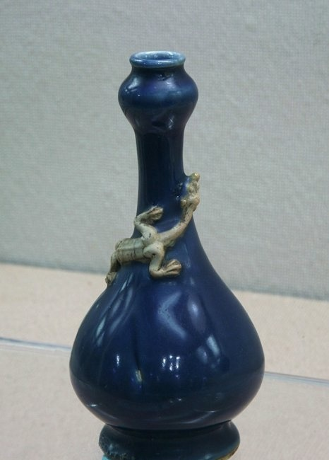 蒜头口,长颈,圆腹下垂,高圈足外撇。通器施高温蓝釉。颈部贴塑素胎螭龙,伸头匍匐前进,形态传神逼真。