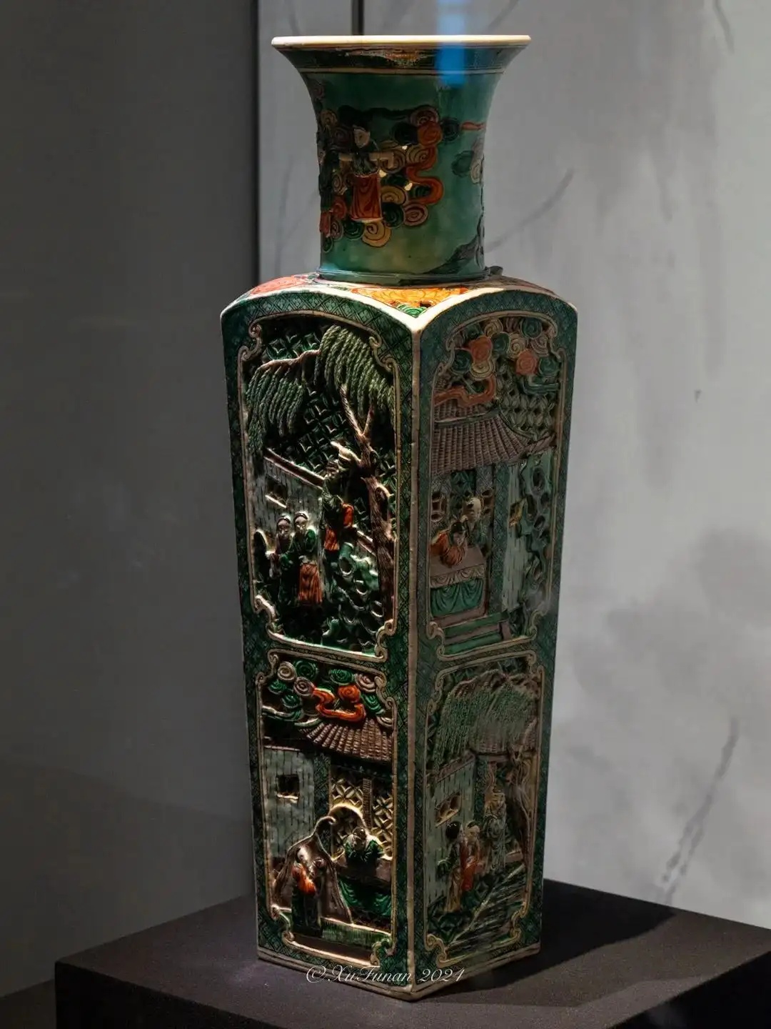 五彩镂雕西厢记故事图方瓶 清光绪 公元1875—1908年