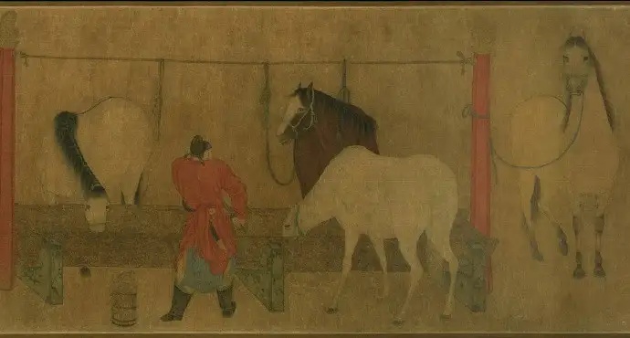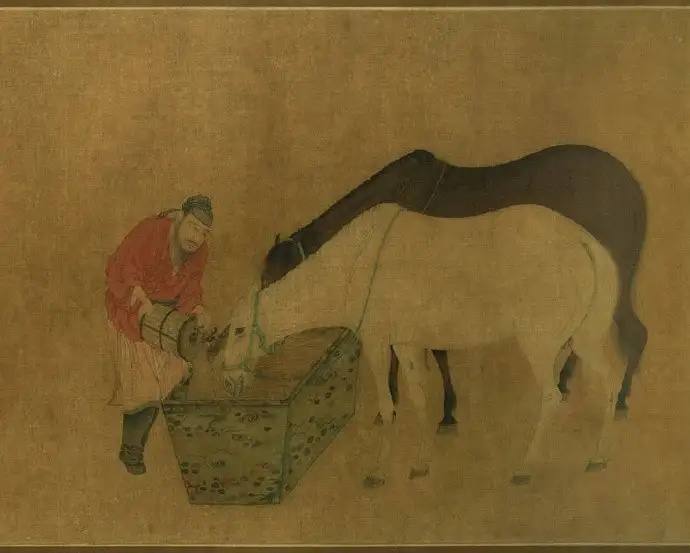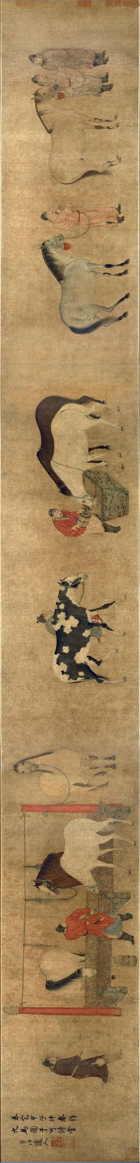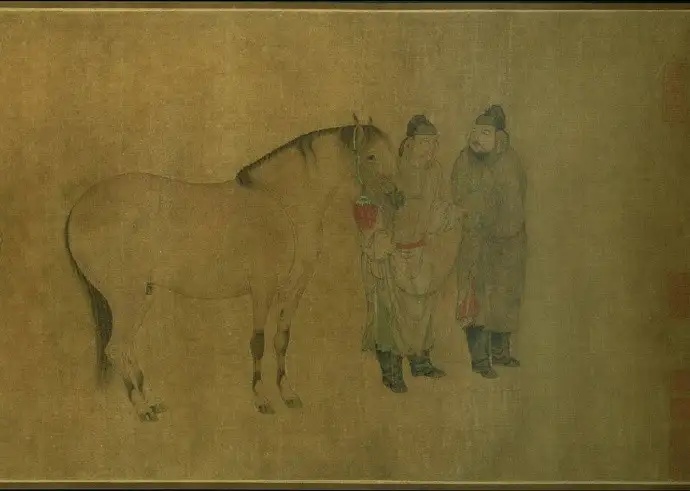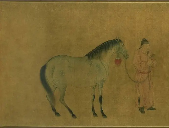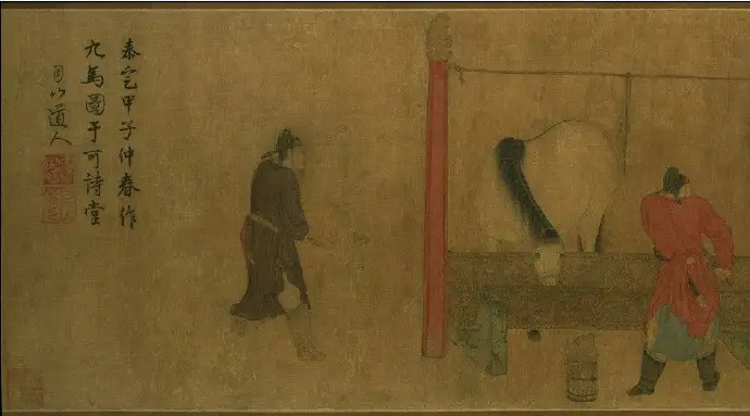 其实任仁发画的马,据说均摹自域外贡驹,其高超的绘骥之技赢得了众多明代诗人的赞誉。譬如祝允明星堂集》卷五中,便有一首《任月山九马图歌》:“世无神手有神马,眼底谁能分造化。邹阳示我轴有咫,惊绝纵横电光起。定观始识任都水,马后金声出吴李。"作者原本感叹鲜有画马神手,但当友人取出一幅“惊绝纵横电光起”的九马图给他看时,他随即看出是出自任仁发之手(都水为任氏之职),大加赞赏其马身后似带金戈之声。沈周也在《石田诗选》卷七载有一首《任月山紫马》:“霜蹄炯炯映白颠,凤头宛宛鬃一偏。黄沙惨淡耸隅目,所向万里无风烟。青丝络头未受牵,一团紫云凝不前。此马所见世上少,神气德力无不全。子明水监到渥洼,眼亲识之手敢传。只愁奋迅裂卷去,四座错愕心茫然。”诗中所言“子明”为任氏之字,“渥洼”则为传说中的神马产地。诗称任氏曾以职务之便到渥洼,因而所画之马极具风神。元末明初书画家杨维桢,也曾以一首热情洋溢的《题跋月山公九马图手卷为任伯温赋》(载清钱谦益《列朝诗集》),对任氏画马发出由衷钦赞。尤其"任公一生多马癖,松雪画马称同时。……任公承旨写神骏,妙笔不数江都王"几句,赞其笔下之马可与赵孟相提并论,而“江都王”则为以鞍马擅名的唐人李绪,在杨维桢看来,任氏之马已然超逸了李绪。