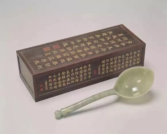 通长26.8公分 通宽8.1公分、浅碧绿色玉,尚称光润。杓身椭圆而带尖,光素。杓柄琢平行三角形纹,柄端立雕一小花蕾。杓底加琢乾隆三十五年(1770)御制诗四十字:掌非周玉府,攻自泰西瀛,绝胜舒州杓,何须力士铛。璞原误荆国,蕊特艳昌城,试问宜谁赠,应调傅说羹。并刻「乾隆庚寅春御题」七字及「比德」玺文一方。同一诗亦刻字泥金於宫中所配制之紫檀木盒的盒盖上方,盒盖周围还加刻了六位大臣所唱和的诗篇。经核查《清高宗御制诗文全集》可知,该诗的诗题为「题痕都斯坦玉杓」,收录於御制诗三集卷86页25。、