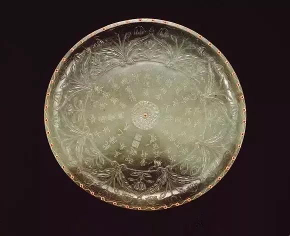 径 25公分 高4.7公分、此盘,器呈二十四瓣花形,盘心琢一番莲,外壁浅浮雕茛苕叶一圈,而底部则装饰成一朵层层绽放的八瓣花,从形到纹、从里到外,花团锦簇,呈现一种细致甜美的气质。 本器的内壁则有中国玉工加琢的清高宗御制文,也就是前述的「天竺五印度考讹」的节录,全文收录在[清高宗御制诗文全集]文二集二一卷二~五页。