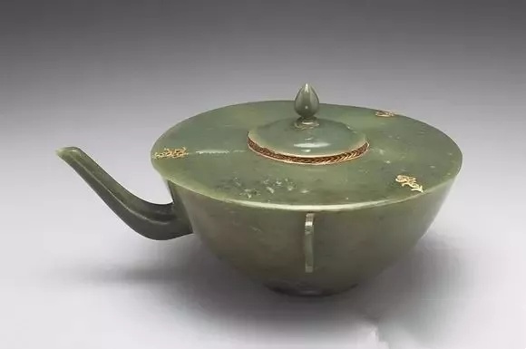 全高11.2公分 口径17公分 底径6.1公分、玉质,碧绿色。壶,直口,圆弧腹,矮圈足,一对耳朵形把手,管状细长流,平盖,盖钮作桃形。盖面中心浮雕一圆面,钮与圆面、圆面与盖面的交际,填饰金泥及赭色颜料。盖缘三处嵌金丝和红玻璃,作花草纹。把手镂雕莨苕叶纹。此壶纹饰富伊斯兰玉器风格。