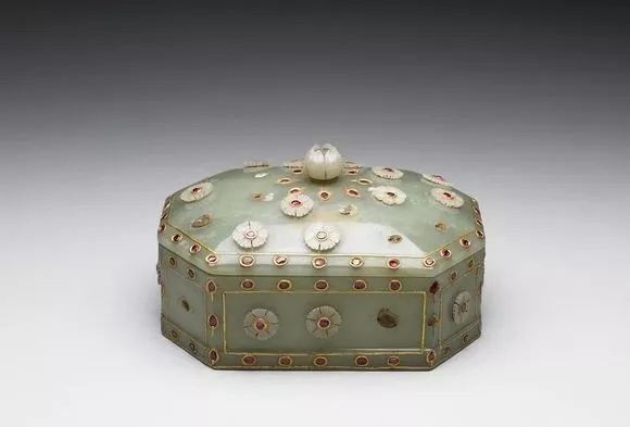 青玉。作八角形盖盒。全器以白玉、红玻璃、金丝嵌饰花纹,盖顶上的白玉钮,作花苞状。镶宝石及金丝绕边点缀,展现痕都斯坦装饰风格。