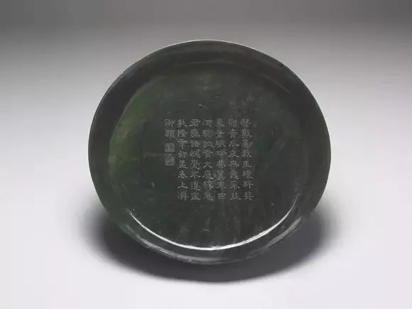 全高3.9公分 口径24.7公分 底径14.7公分、玉质,深碧绿色。盘,敞口,浅壁。盘心刻乾隆於辛卯年(1771)所作之诗文隶款。此盘以锦袱包裹,藏於清宫。