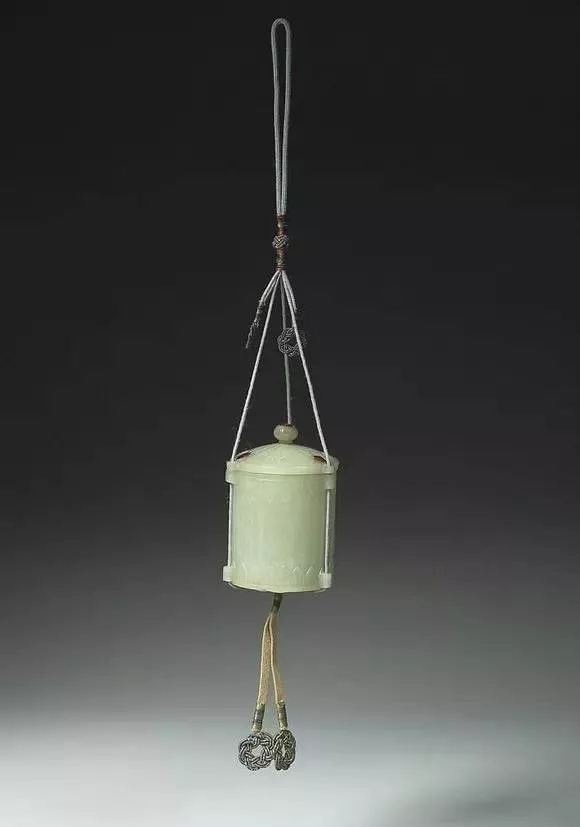 通盖全高7.4公分 径4.9公分、玉灰青色,底足有伤缺。器作筒形,附钮盖、平底,盖、器三处有贯耳,可以系绳,附结绳。全器琢叶纹,盖嵌红色玻璃四块。仿印度玉作风。