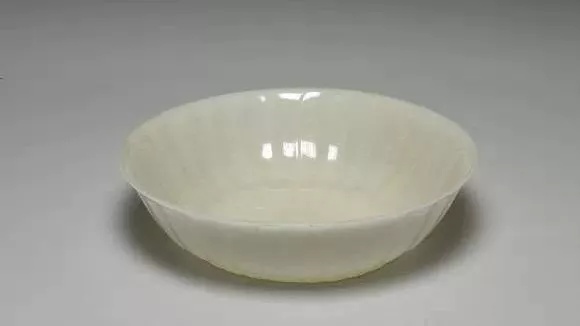 全高4公分 口径13.5公分 底径6.5公分、玉质细白,雕工精美,抛光温润。器作一侈口浅腹的圆碗,底似圈足而平,雕一平展之四瓣花,宽而轻柔的花瓣,略带波纹起伏;围以良苕叶纹一周,两侧边又各琢一良苕叶,由下方向口缘延伸,叶尖向外卷折,垂以花苞形成二器耳。经核查乾隆三十五年(1770)清高宗为此碗赋「咏痕都斯坦玉碗」一诗,并有诗序。(收录於《诗文集》御制诗三集卷86页30)宫中玉工将诗及诗序分别加琢於碗壁的两边。由诗句「形色双合相,磨砻了似无」可知,乾隆皇帝认为它的造形与色泽十分协调,花纹也修饰得细致而不见雕痕,是非常精致的作品,因而成为帝王的日常用器,碗心还琢有「乾隆御用」四字隶款。