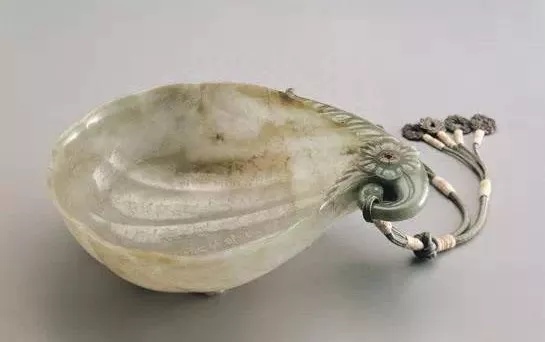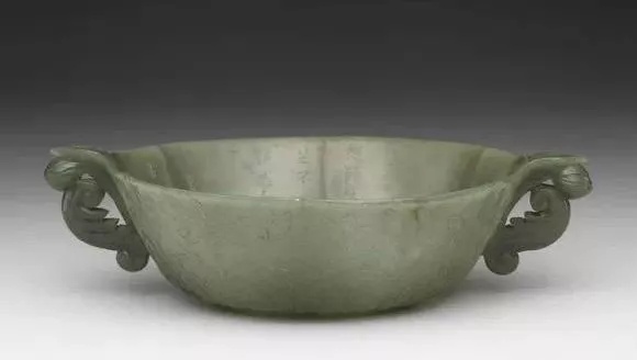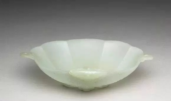 口横20.9公分 口纵14公分、玉质。器作贝形,有耳二,底琢为六瓣花饰,系仿痕都斯坦玉器装饰作法。底旁有自贝顶延伸而来的细长叶纹.