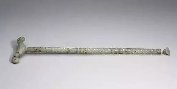 全长47公分 架宽13.3公分 最厚2.2公分、青玉,玉色泛白。全器为长柄,顶端横作一弯架。柄饰有纽丝纹及叶纹,分为三节,每节头尾以镶嵌铜丝及红玻璃饰花叶纹,已脱落。为痕都斯坦风格玉器。附绣花布套。