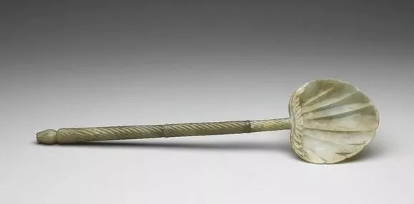 青玉,有赭斑。杓面宽扁,作瓜棱状,杓尾端饰莨苕叶纹。柄分三节,雕纽丝纹。柄端琢莨苕花苞。为痕都斯坦风格玉器。附纸胎锦面器座与印花布套。