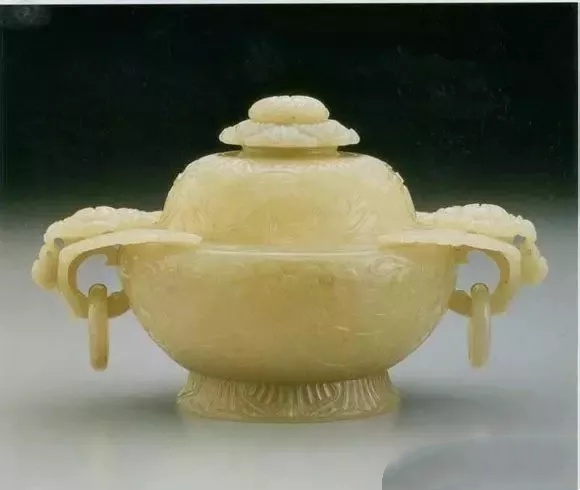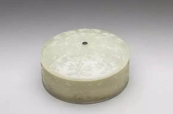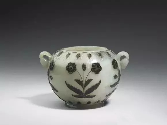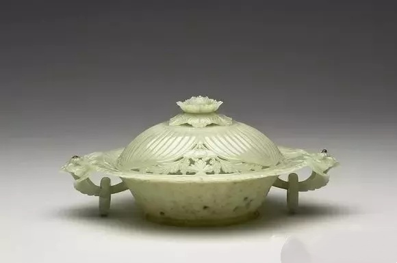 通高10.8公分 宽18.5公分 口径10.7公分 足径8.0公分 玉盖口径9.8公分、青玉泛灰。圆形炉身的两侧饰以双叶衬朵花带环式耳,这是一种融合痕都斯坦玉器风格的装饰手法。炉身的外壁则浅浮雕连枝花叶纹,而近足处及圈足上均饰花瓣纹。器盖以朵花形钮为中心,外围花瓣纹及连枝花叶纹。
