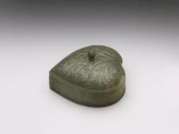 全高6.9公分 长11.1公分 宽10.1公分、碧玉,玉色泛灰,间有黑斑点。有盖,直壁、平底。器作几荷桃实形,盖钮作球形立雕花蕊,为盒上浮雕莨苕花叶的一部份,盒壁上则浮雕花朵卷叶式连续图案。为痕都斯坦风格玉器。附束绳印花布套,上有黄签