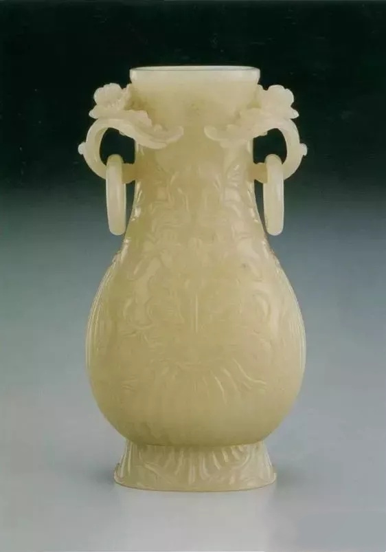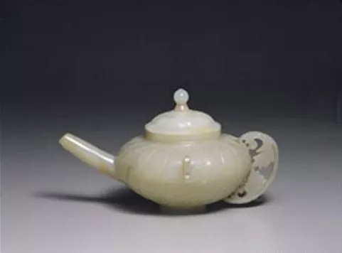 闪玉质,甚为光润。敛口,硕腹,管状流,圈足、足径略小於口径,有把,有盖,桃形盖钮,腹部前后均有环。器身与器盖均以低垂的花朵为造形:中心似火焰状的纹样是花托,周缘排列整齐、略带弯弧的线条则是表现欲开未开的花瓣。器把则琢为花茎,把内镂雕叶片。全器散发一种柔美细致的风味。本器亦为外来的「痕都斯坦玉器」,如细分则属「蒙兀儿玉器」(Jade of the Mughals)。「蒙兀儿玉器」承袭中亚帖木儿帝国(Timurid Empire)及波斯萨凡伟王朝(Safavid dynasty)的玉作传统,并吸收印度、中国及欧洲的造形、纹饰素材。而其华丽、细致的贵族气质深深吸引清高宗,由是,多少影响了当时的宫廷玉作,为中国玉器注入些许新的素材。